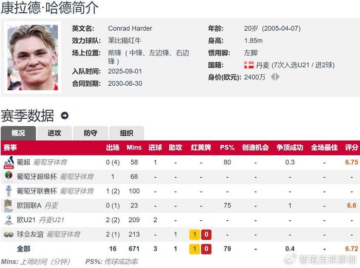 据德转数据显示,现年20岁的丹麦前锋哈德尔于9月1日以2400万欧元的转会费从葡萄牙体育加盟莱比锡。这位丹麦前锋将接过奥蓬达加盟尤文图斯离队后的11号球衣。