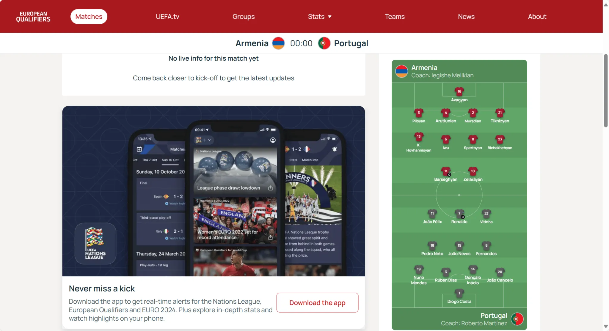 虎扑09月06日讯 世界杯欧洲区预选赛F组第一轮,亚美尼亚主场迎战葡萄牙。赛前,双方公布了首发阵容。