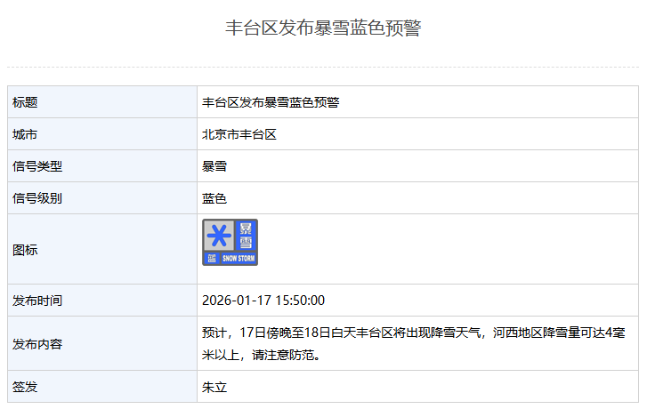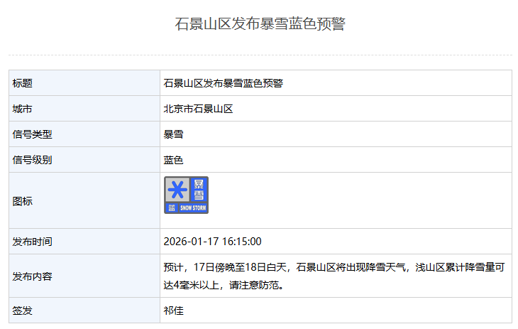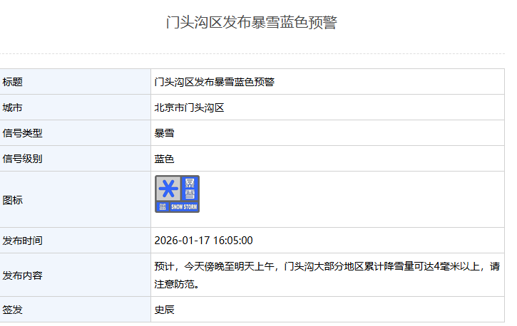 新京报讯 据北京市气象局网站消息,目前,北京房山、丰台、昌平、门头沟等区已发布暴雪蓝色预警。详情如下:房山区发布暴雪蓝色预警丰台区发布暴雪蓝色预警昌平区发布暴雪蓝色预警门头沟区发布暴雪蓝色预警石景山区发布暴雪蓝色预警编辑 辛婧